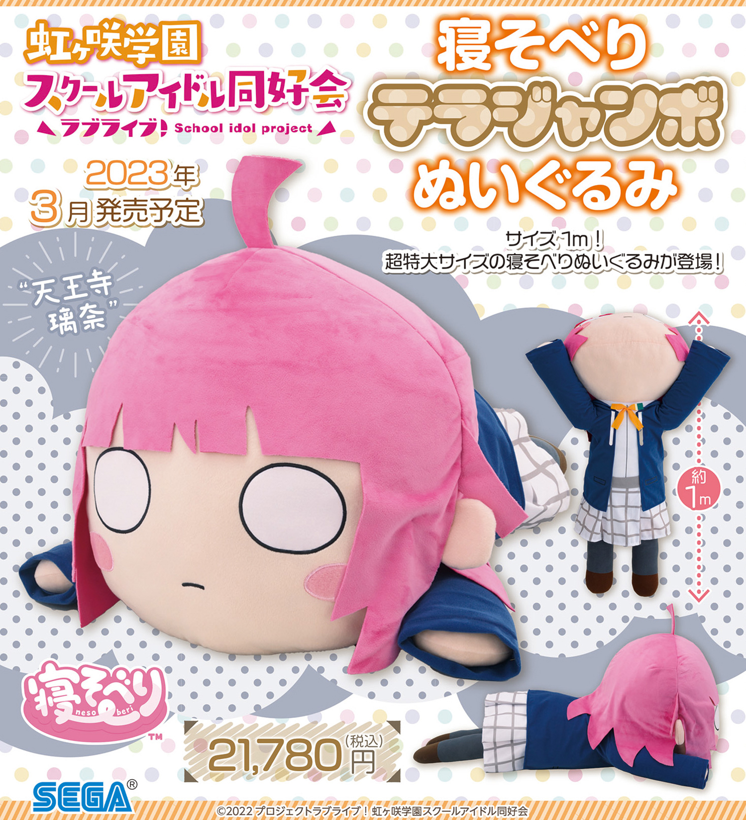 2023年3月に“天王寺璃奈”がセガオリジナル、全長約1mと超特大サイズの「寝そべり テラジャンボぬいぐるみ」に仲間入り☆
